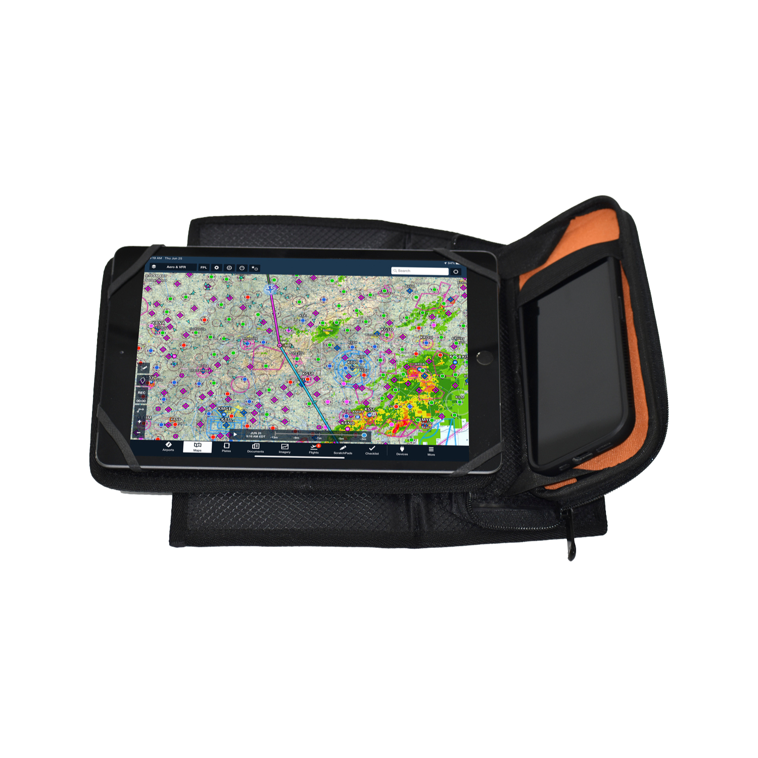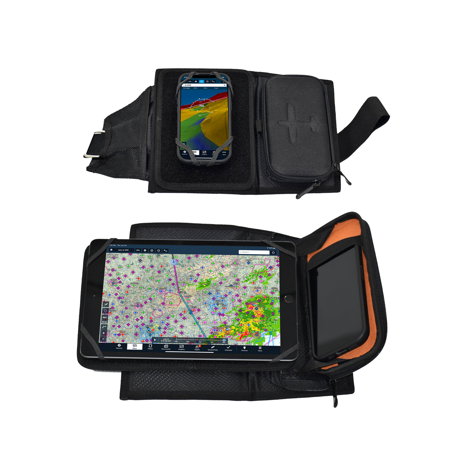 These iPad holders enable you to customize the layout of your kneeboard deck. The large iDeck Kneeboard includes a spacious silicone holder and a smaller one for an iPhone, while the small iDeck Kneeboard features an iPad mini holder and a cell phone holder. This configuration allows pilots to arrange both an iPhone and iPad on the main deck of the kneeboard, providing unparalleled flexibility and versatility. Alternatively, if you prefer a more traditional kneeboard layout with only the iPad on the deck, the iDeck Kneeboard also integrates the popular side EVA case from our Centerline Kneeboard. This fold-down EVA case serves as an additional writing surface or storage/display area on the kneeboard.