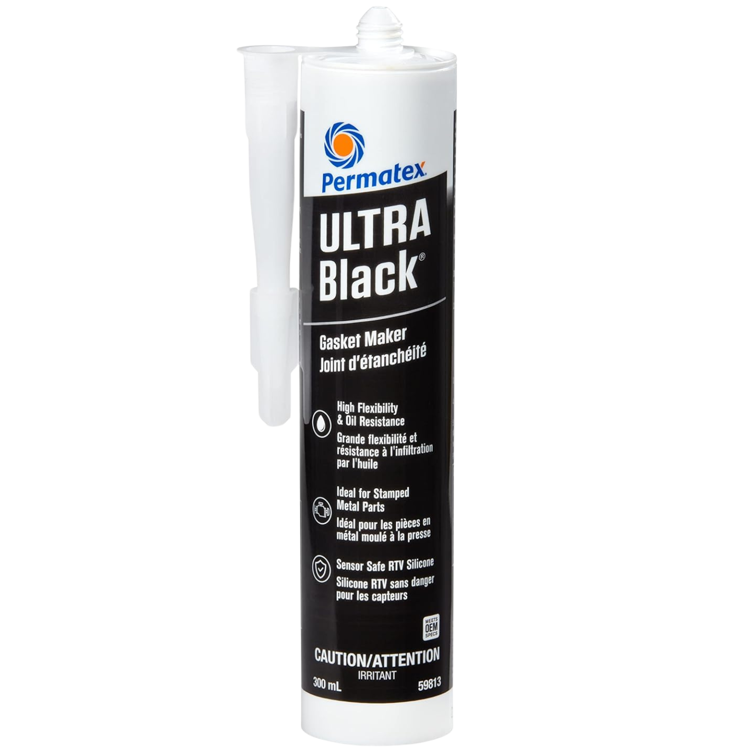 Permatex Ultra Black retains high flexibility and oil resistant properties through use of a patented adhesion system. Ultra Black is sensor safe, low odor, and non-corrosive with resistance to oil, shop fluids, and vibration. This sensor-safe, low odor, non-corrosive formula meets performance specifications of OE silicone gaskets and can be used on high flexibility and high oil resistant applications such as timing covers, transmission pans and oil pans.